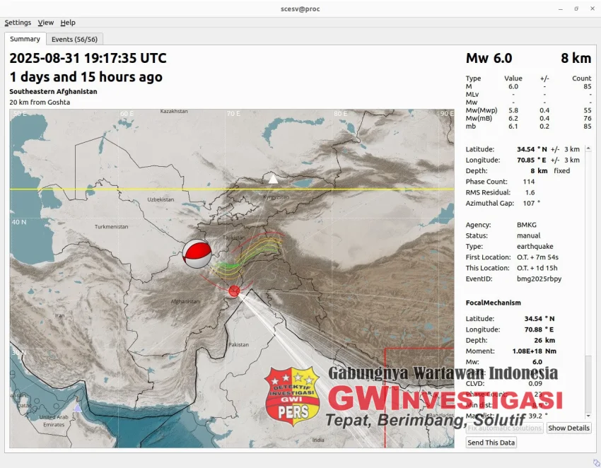 Jakarta, InvestigasiGWI.com | Afghanistan kembali diguncang gempa tektonik dahsyat berkekuatan M6,0 pada Senin (1/9/2025) dini hari. Episenter berada di darat, sekitar 27 km timur laut Jalalabad, Provinsi Nangarhar, dengan kedalaman sangat dangkal 8 km—faktor yang membuat guncangan menjadi sangat merusak.