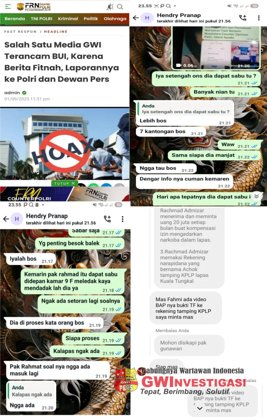 InvestigasiGWI..com | Pertarungan opini publik terkait dugaan peredaran narkoba dan praktik setoran ilegal di Lapas Kuala Tungkal semakin memanas. Media Gabungnya Wartawan Indonesia (GWI) menegaskan bahwa berita mereka bukanlah fitnah, melainkan hasil investigasi yang dibuktikan dengan BAP, rekaman video, dan kesaksian saksi kunci.
