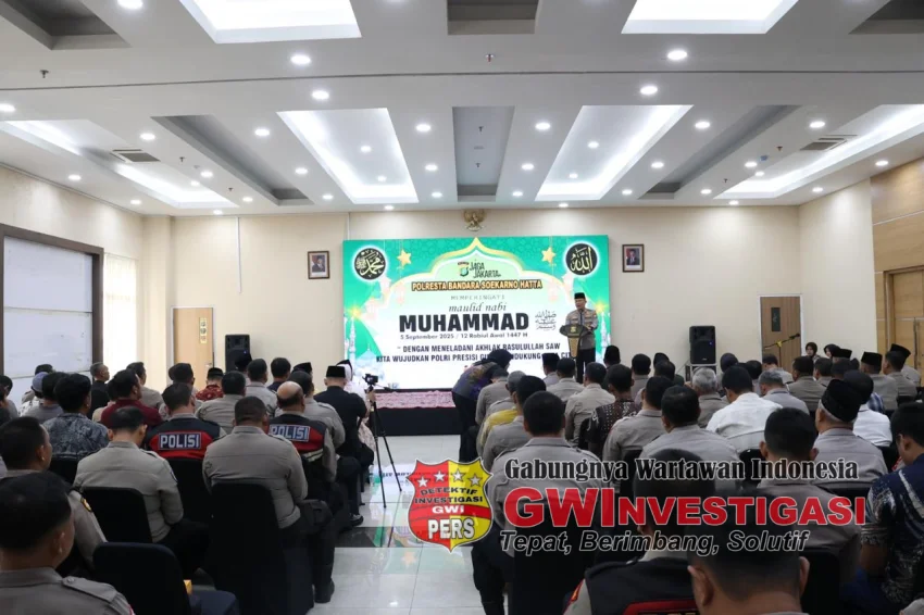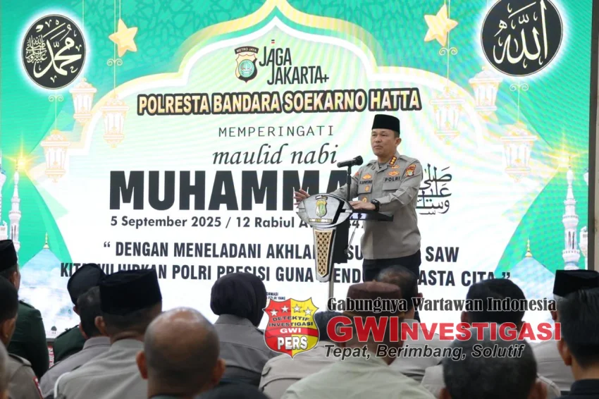 Tangerang – InvestigasiGWI.com | Polresta Bandara Soekarno-Hatta (Soetta) menggelar peringatan Maulid Nabi Muhammad SAW 1447 H/2025 M, Jumat (5/9). Namun pesan yang disampaikan Kapolresta, Kombes Pol Ronald Sipayung, cukup keras: jangan jadikan Maulid hanya formalitas tahunan tanpa perubahan nyata di lapangan.